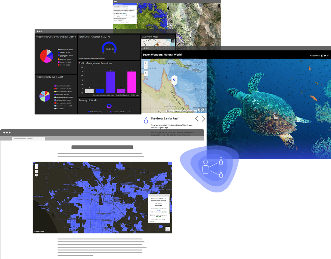 Sie können mithilfe vorkonfigurierter Komponenten einzigartige Webanwendungen für Ihre Zielgruppe erstellen oder selbst Apps entwickeln. Verwenden Sie die in ArcGIS Online erstellten Daten, Analysen und Karten als Grundlage für Ihre Apps.